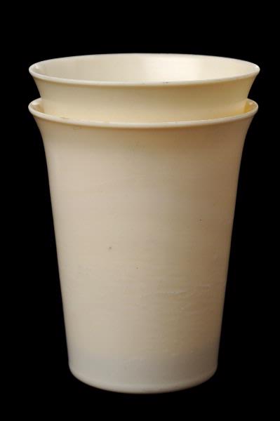 MS 11626. Tandborstmuggar av beigegul plast, H 90, Diam 75/50. 2 st utgår 2008-06-25.