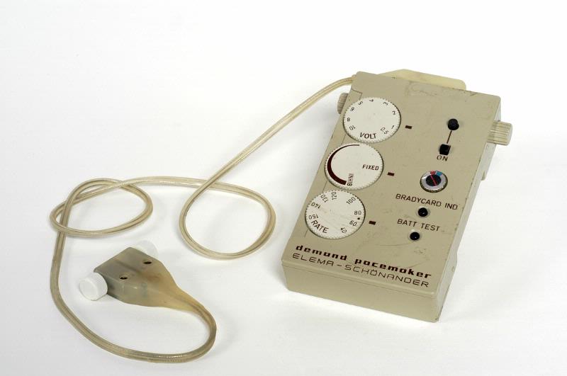 - Extern pacemaker i grå ask, märkt: demand pacemaker, Elema-Schönander. Till vänster på ovansidan 3 vita, runda vred, till höger svarta on-off knappar, indikatorknapp samt 2 svarta testknappar för batteri. Försedd med hållare att fästa i livrem samt batterifack innehållande stavbatteri märkt: Mallory Duracell® Mercury Battery. Batterifacket även märkt: THX OP.