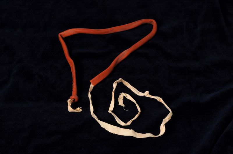 MS 12411. Gummislang. Röd. L 570 mm Diam 10 mm. Genomdragen med gulvitt bomullsband, L 1300. Förvarades i fodral MS 12410. Gåva av Gunilla Hecktor, Utsittaregränd 210, Lund.