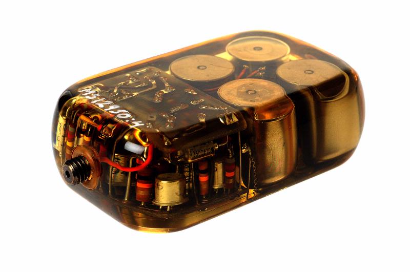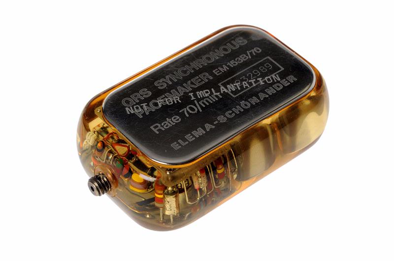 MS 12950.4. Pacemaker i gulaktig, genomskinlig plast. B 4 cm, L 7 cm. Man kan se fyra st batterier och ett kretskort. På ovansidan sitter en metallplatta med ingraverad text: "QRS SYNCRHRONOUS PACEMAKER EM 153B/70 Rate 70/min 1232989 ELEMA-SCHÖNANDER". Över texten är ingraverat: "NOT FOR IMPLANTATION". Gåva av Bertil Sandell 1998-10.