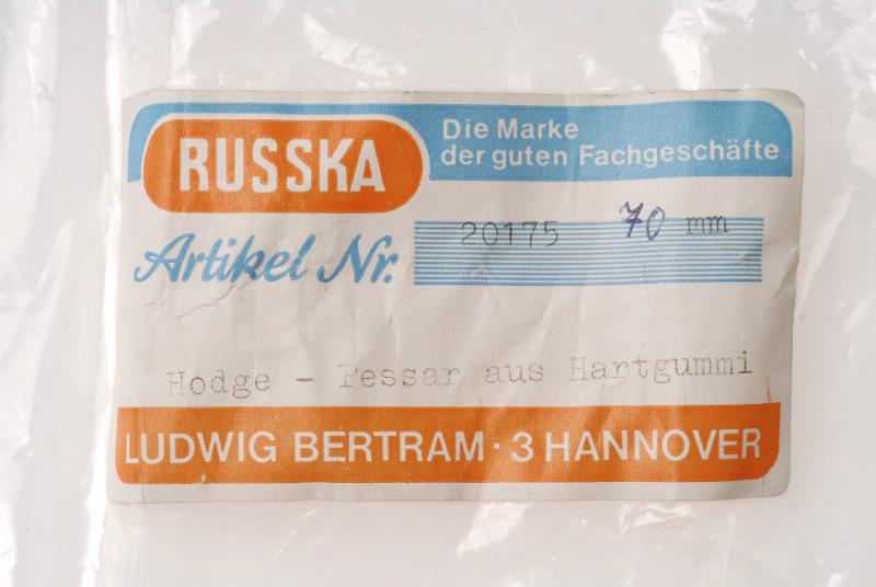 MS 12954.56. Pessar i svart hårdgummi i plastförpackning. Är av märket "Russka - Ludwig Bertram 3 Hannover". Etikett med artikelnummer 20175 och storlek 70 mm. Förpackningen förslutningsbar. L 18,5 cm, B 12,3 cm. Gåva från Kvinnokliniken 1998-07.