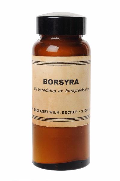 MS 12896. Borsyra. I brun glasburk med skruvlock av svart bakelit. Vit pappersetikett med texten: "Borsyra Till beredning av Borsyrelösning Aktiebolaget Wilh. Becker Stockholm. H 90 mm Diam 35 mm. Placerad i medicinskåpet MS 12870. Gåva av Orupssanatoriet genom Tommy Alklind 1999-06-04.