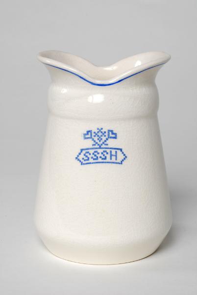 MS 13368. Mjölkkanna. Av porslin. Dekorerad med blå rand. "SSSH" och dekorationer i blått, ser ut som korsstygn. H 12 cm Br 8 cm. Tillverkningstid 1040-1942 av Rörstrand, Lidköping, Sverige. Modell: Löfbergs Malmö. Funnen omärkt vid inventering 2009. Gåva av SSSH 1992-04-02. Se Uppgiftsbok 97.