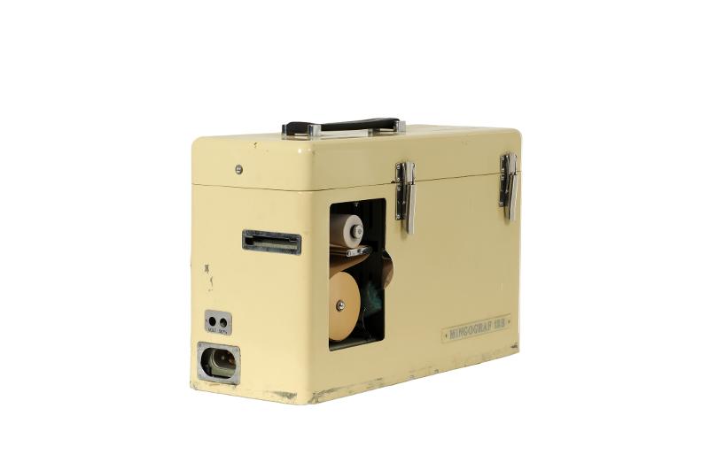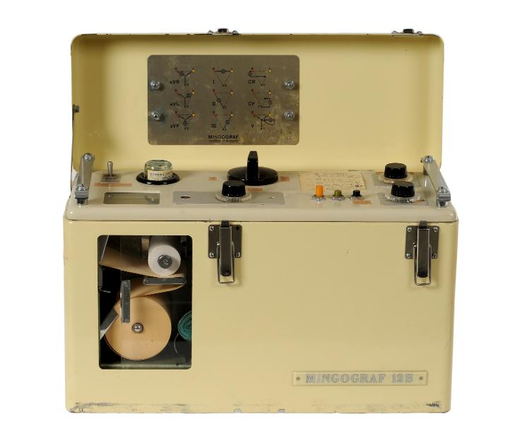 MS 13390. Mingograf. System Elmqvist. En flerkanalig bläckstråleskrivare som är allmänt förekommande på sjukhus. Av järn. L 42 cm Br 16 cm H 28 cm. Tillverkad på 1950-tal eller 1960-tal av Elema-Schönander produc. Järnhs i Stockholm-Solna. Modellnamn: "12 B". Funnen omärkt vid inventering 2009.