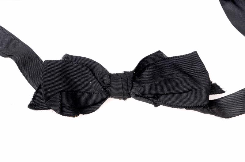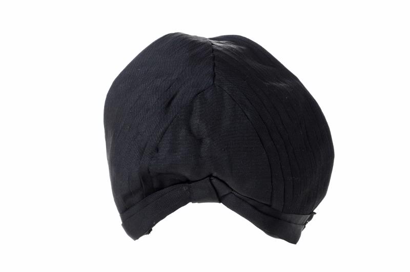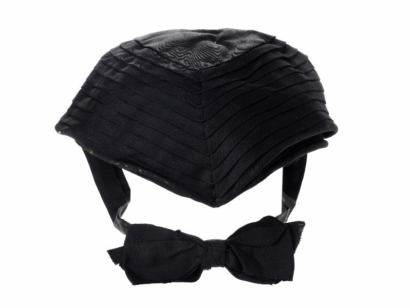 MS 12973. Sjuksköterskeklänning, mörkblå, spets vid ärmslut och krage. Metallknappar upptill och metallkrokar längs med resten av stycket framtill (och knappar). Band på ärmen märkt "Södra Sveriges sjuksköterskehem". SSSH brosch på vänster bröst. Brosch vid knäppning vid halsen. Svart hätta från Kaisers Modeaffär Göteborg. Plisserat tyg. 2 vita ärmmanschetter, broderade. Vit kragmanschett, broderad.