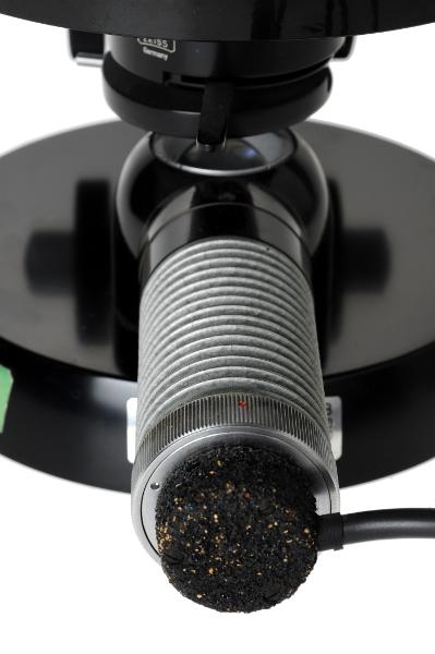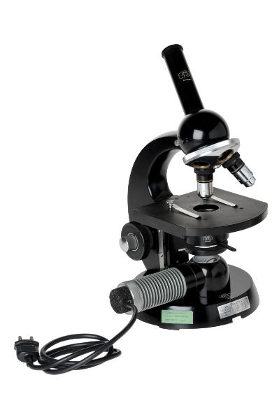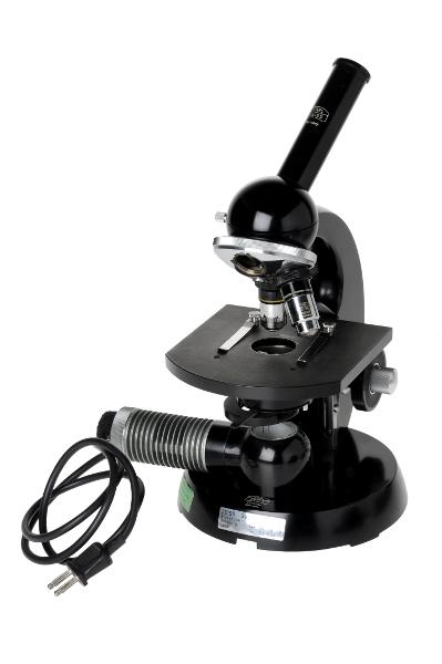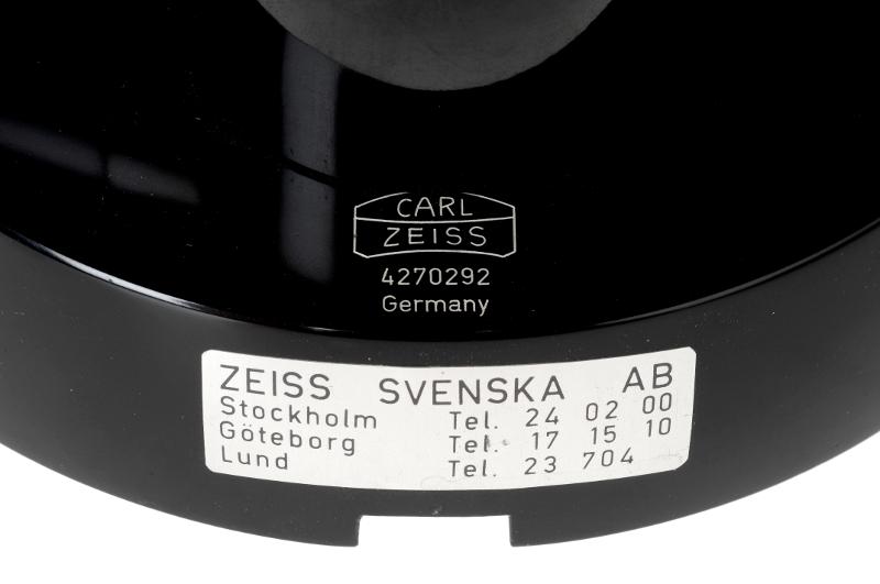 - Elektriskt, svart mikroskop med rund fot. Är märkt "Carl Zeiss". På foten en grön etikett med text: Cytodignostiska Centrallaboratoriet, Lasarettet i Lund. Även en silveretikett med text: Zeiss Svenska AB.