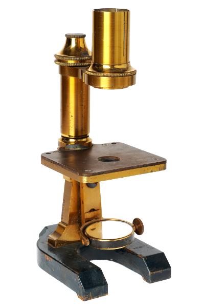 MS 13089. Mikroskopstativ av mässing. L 12 cm, B 8,5 cm, H 21 cm. Hästskoformad bottenplatta. Bottenplattan lackerad grön. Objektplatta 8 cmx7 cm. Mikroskopstativet är avsett för undersökningar i påfallande ljus. Optik saknas. Funnet omärkt vid inventering 2009.