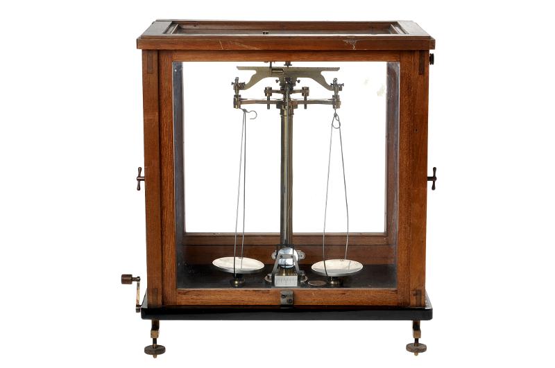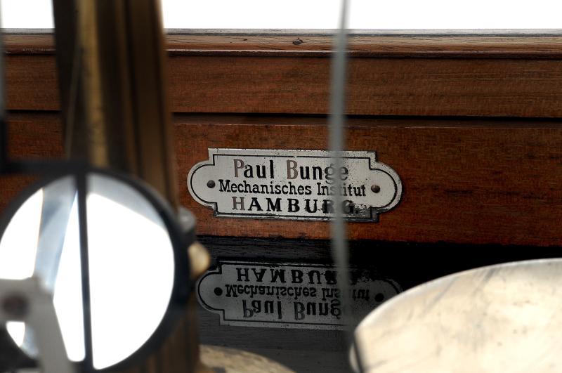 Balansvåg innesluten i ett skåp med sidor av glas. Stativet kan regleras med hjälp av en vev som sitter på utsidan. Skalan läses av genom inbyggt förstoringsglas. Inuti skåpet, på ena sidans träram, sitter en skylt med texten: "Paul Bunge Mechanisches Institut Hamburg".