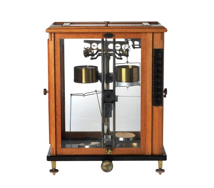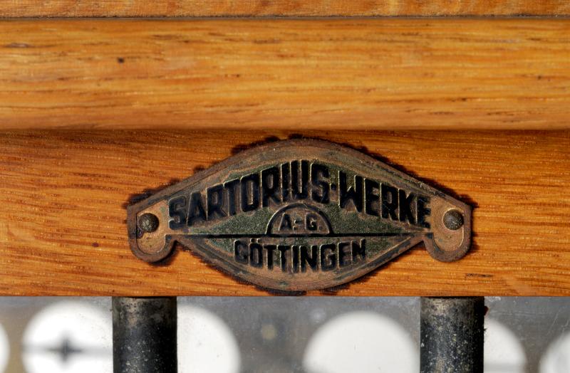 Analysvåg innesluten i ett skåp med svart bottenplatta, dörrar av glas och glaslucka ovantill. På framsidans ena kant sitter 8 knappar märkta 10,20,50,100,200,500 mg. Skalan avläses genom inbyggt förstoringsglas. På framsidans övre kant finns skylt med texten: Sartorius-Werke AG Göttingen.