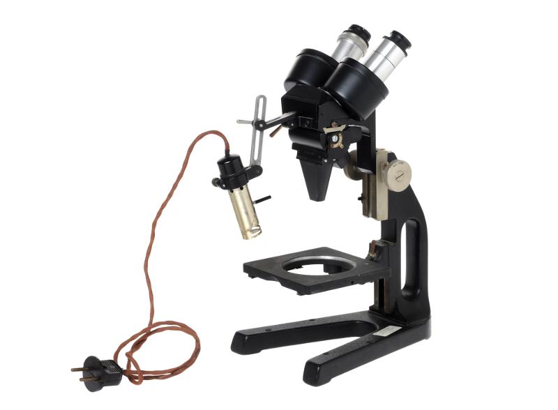 MS 13586. Mikroskop. Av metall och glas. L 16 cm Br 21 cm H 36 cm. 3 objektiv och lampa fastsatt på mikroskopet. Elektrisk, klädd sladd. Objektplatta saknas. Tillverkat av C Reichert, Wien, Österrike. Modell "nr 204909". Signerat "Patologiska institutionen, Lund" samt "Lunds Sjukv. distr. Pat". Funnet omärkt vid inventering 2009.