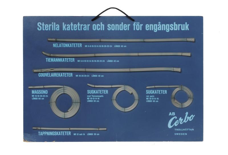 MS 13588. Kateter. Reklamprodukt för sterila katetrar och sonder för engångsbruk från AB Cerbo. Katetrarna och sonderna är uppspända på en blå kartongskiva. Av papp och gummi. L 49 cm Br 34 cm. Tillverkare är AB Cerbo, Trollhättan, Sverige. Funnen omärkt vid inventering 2009.