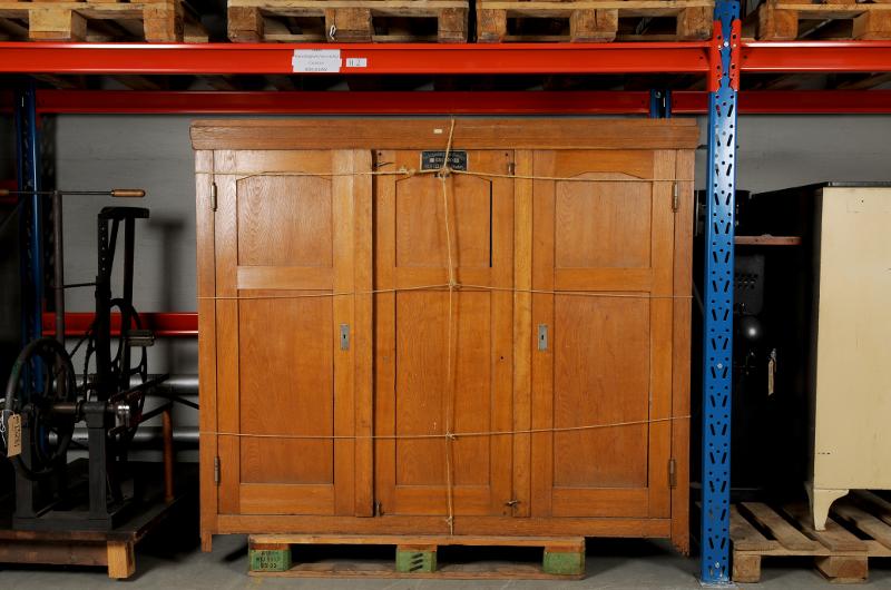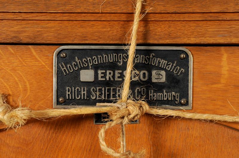 MS 13591. Högspänningstransformator. Av trä och metall. Br 177 cm H 154 cm. Tillverkad ca 1914 av Rich. Seifert & Co, Hamburg, Tyskland samt Eresco, Polen. Brunt skåp på fyra ben med enankaromformare och synkront roterande likriktare. Antagligen hört till en röntgenavdelning. Funnen omärkt vid inventering 2009.