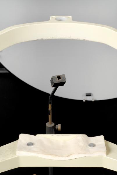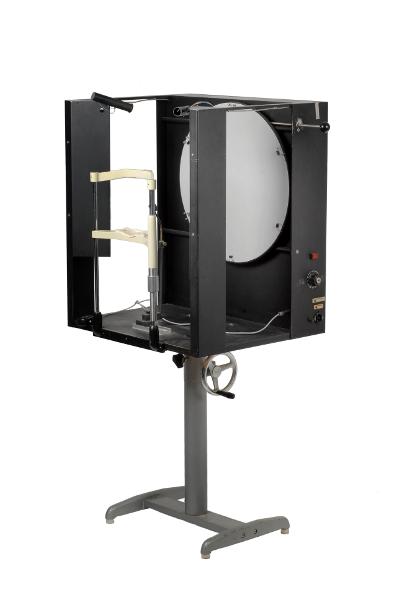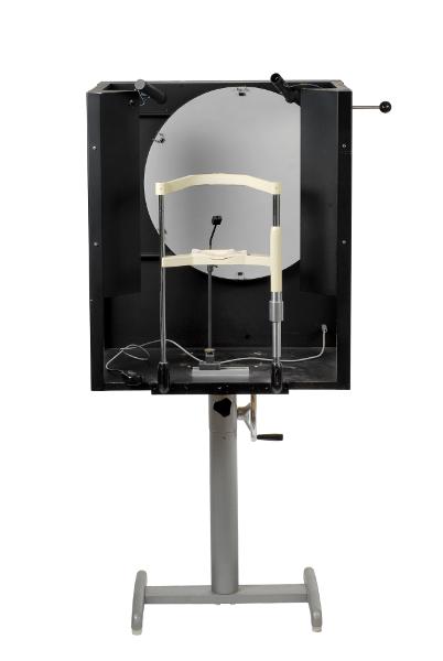 MS 13274. Perimeter. Av metall. L 56 cm Br 36 cm H 132,5 cm. Prototypkonstruktion av en perimeter som användes vid forskning av A. Heilj C: E. T. Krakau. Byggd på verkstaden på ögonkliniken 1975. Under forskningen/undersökningen var avtalet patienter som inte förstod systemet för många för att få fram ett säkert resultat. Prototypen är original, dvs den som användes i forskningen. Med apparaten finns undersökningsrapporten, se Uppgiftsbok 94. Funnen omärkt vid inventering 2009.