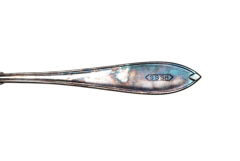 MS 13221. Sked. L 21 cm, B 4 cm. Material: alpacca. Tillverkare: Gense. Tillverkningstid: 1950-tal (?). Matsked i nysilver med spetsigt skaft. På ovansidan stämplat "SSSH" och på undersidan "Gense Alp. 45 gr." Funnen omärkt vid inventering 2009.