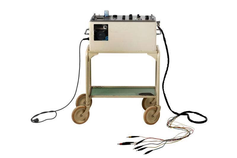 MS 13258. Mingograf. L 69 cm Br 33 cm H 100 cm. Bläckstråleskrivare med tillhörande sladdar och reglage ovanpå. Står på vagn med fyra hjul. Tillverkad under 1960-talet (?) av "Elema - Schönander". Modellnamn: "Cardirex 31 B nr 24167 - 9". Användes till att skriva ut EKG-kurvor på Psyk.mottagingen, MLL. Funnen omärkt vid inventering 2009.