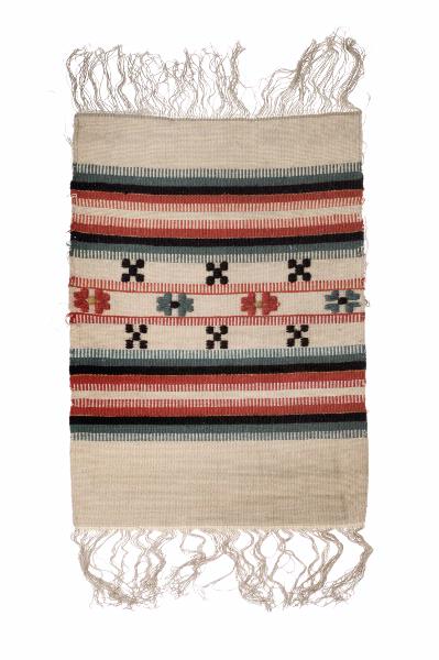 MS 12998.69. Duk alt. vävprov. L 49 cm (exkl. frans, oknutna), B 33,5 cm (=vävlor). Varp i oblekt linne, inslag i ull, randig i oblekt (botten), grönt, svart, tegelrött med allmogeinspirerat mönster. Något trasig ena långsidan.