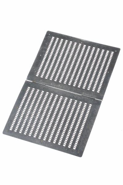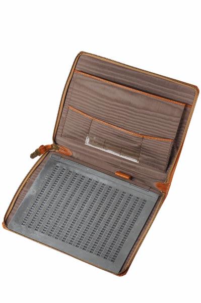 MS 12998.974. Reglett. Av metall, tyg, konstläder och trä. Mått: 24 x 32,5 cm (yttermått väskan). a: A4-formad reglett, vändbar, för punktskrift, 22 x 29 cm. b: brun konstläderväska för ovanstående. c: stift för att göra punktskrift, 6,5 cm. Förvärvad 2005-10-13 från Annetorpshemmet genom Ingrid Rigo, anpassningslärare. Utgår 2008-09-03.