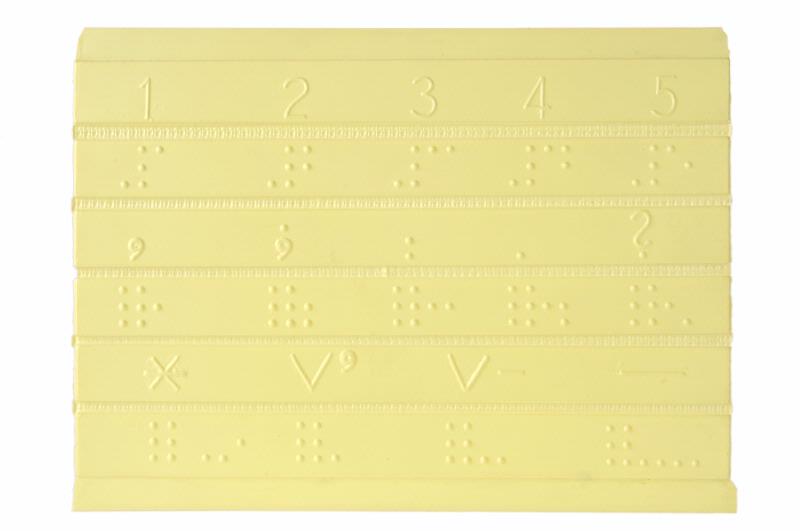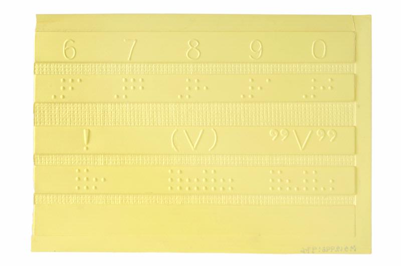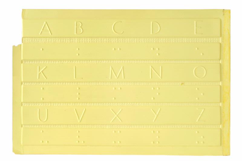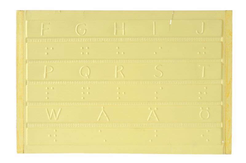 MS 12998.976. Hjälpmedel. För synskadade. 4 sidor plastark med alfabetets bokstäver och punktskrift samt siffror och skiljetecken. Användbar för den som kan bokstäver och skiljeteckecken för att lära punktskrift. Mått: 14 x 19 cm. Av gul plast. Förvärvad 2005-10-13 från Annetorpshemmet genom Ingrid Rigo, anpassningslärare.