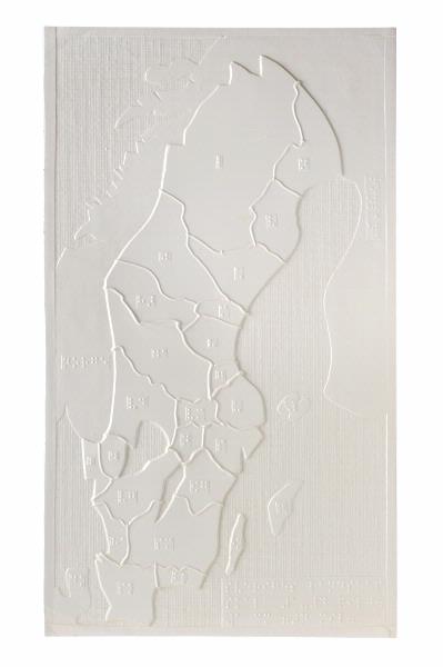 MS 12998.1052. Sverigekarta. Hjälpmedel för synskadade. Relief i vit plast med landskapsgränser markerade och med blindskrift. Pedagogiskt material. Mått: 23 x 40 cm. I gott skick vid förvärvet. Förvärvad 2004 från Annetorpshemmet.