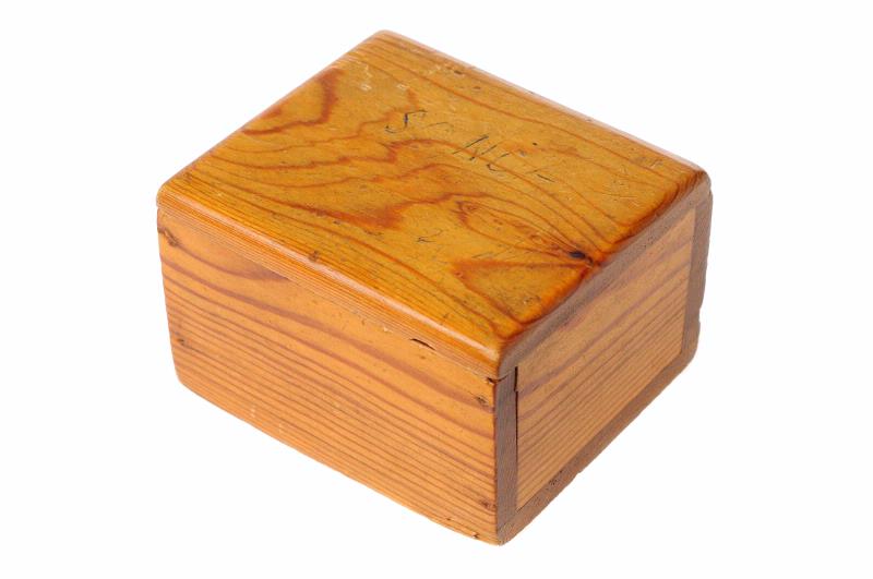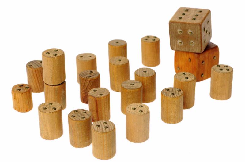MS 12998.1062. Sällskapsspel. Av trä. 1) Trälåda med lock. Innehållande 2 tärningar med punktmarkeringar samt 19 spelpjäser, också med punktmarkeringar. 2) Spelplan för Fia-spel med punktmarkeringar. Förvärvat 2002 från Annetorpshemmet genom Ingrid Rigo.