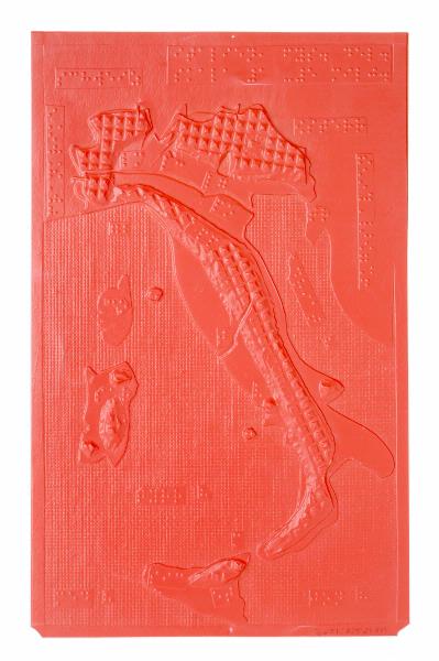 MS 12998.1065. Karta. Reliefkarta i röd plast föreställande Italien. Förvärvad 2002 från Annetorpshemmet genom Ingrid Rigo.