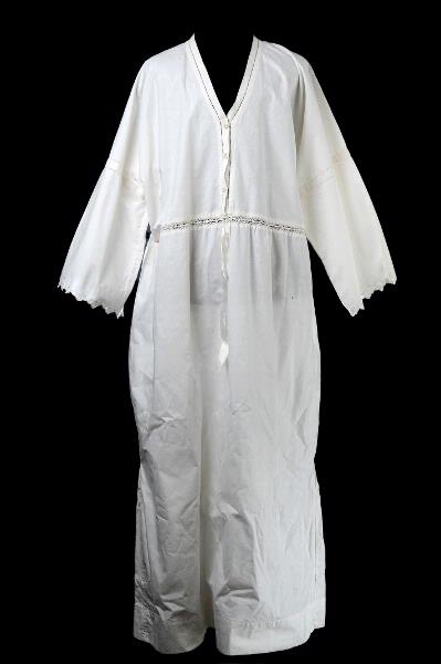 - Av vitt linne, den är fotsid och har kort ärm. Den har broderi kring hals och midja hålsöm, knyts med ljusgrönt sidenband och knäpps med tre handgjorda knappar. Monogram. SA.