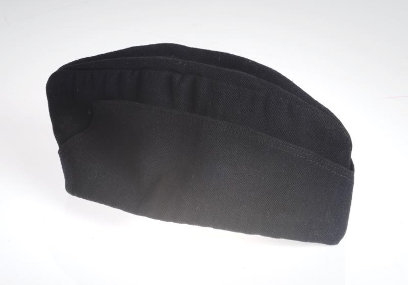 M 605. Mössa. Patient. För sommarbruk, utan skärm, vikmodell. Svart med grå insida. Etikett: "PUB...". Ljusgrå med grå text märkt: "25".