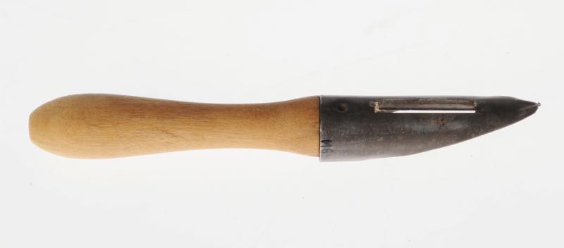 M 641. Potatisskalare. Äldre traditionell typ. Skärande del av metall med spetsig ände. Oregelbunden form på det ljusbruna trähandtaget. L 15,5 cm Omfång 6,5 cm.