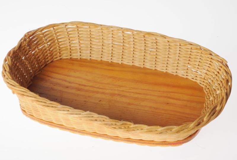 M 113. Uppläggningskorgar, 2 st, flätade med träbotten, oval/rektangulär form. a) något ljusare (uppe) obehandlad botten, b) förnissad botten, tillverkade på S:ta Maria sjukhus (båda). b) Utgår 2013-07-16.