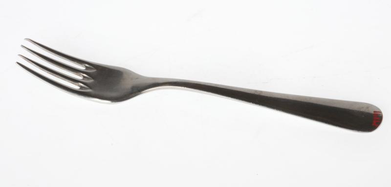 M 141. Gaffel, rostfri, platt runt skaft, märkt "AB Metektro 18-8 Stainless". L 19,2 cm, B 2,6 cm.