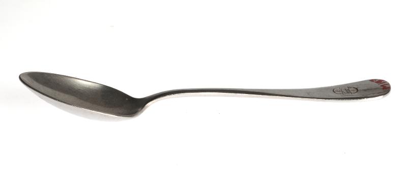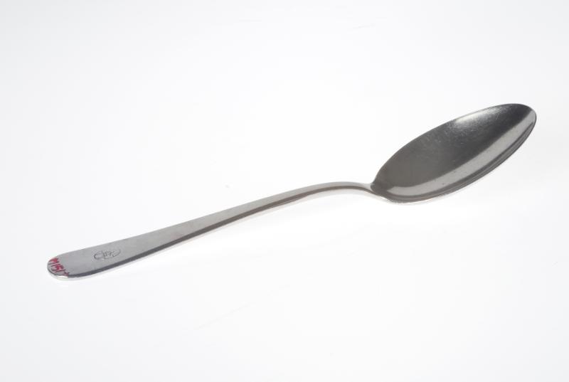 M 151. Skedar, 12 st, rostfria, kraftig modell, rak enkel form, platt skaft, märkta [ovalt emblem med ett kors med kungakrona i mitten], "Gense Rostfritt stål, 4A3". L 20,5 cm, B 4,7 cm.