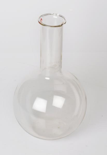 M 214. Rundkolv, glas, rund behållare, med lång utåtvikt mynningskant, (Mätkolv?), märkt: "PYREX 13=S.G.D.G. 1 L. 500", ett platt bottenparti.