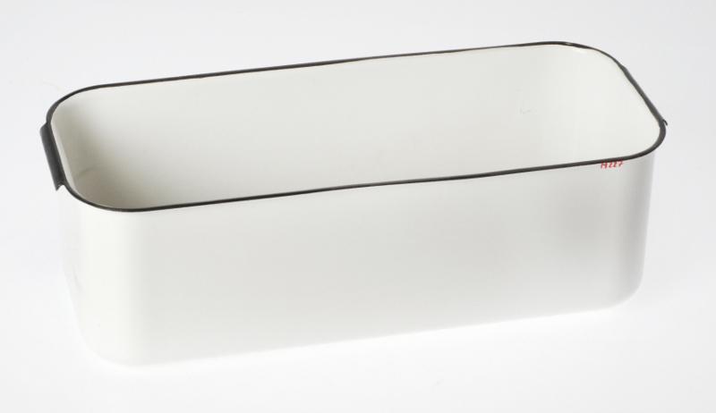 M 227. Förvaringslåda, vit emaljerad, med svart utåtvikt mynningskant, extra brett på kortsidorna för användas till handtag, rektangulär, rka sidor, märkt i botten "KOCKUMS (emblem) SWEDEN". Avskavd färg på ett ställe i botten. L 31,5 cm, B 11 cm, H 11 cm.