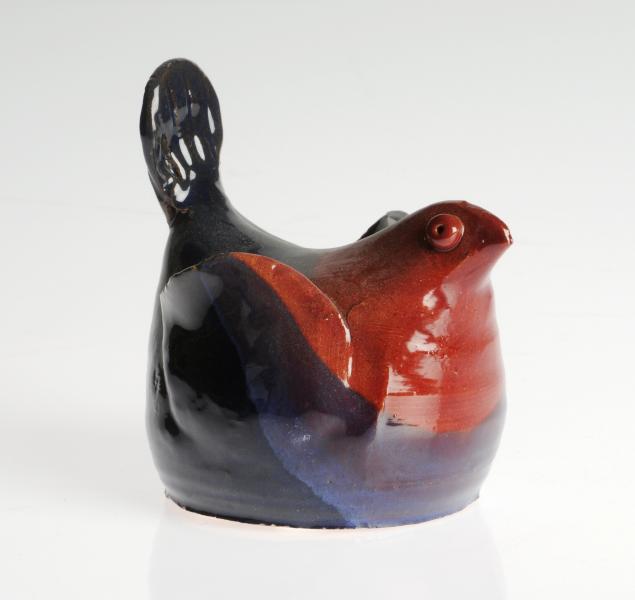 M 817. Fågel. Av keramik. Blå kropp med brunt huvud. Signerad: "P.L.". L 9 cm Br 6 cm H 9 cm. Tillverkad på keramikverkstaden SMS. Gåva av Barbro Malm.