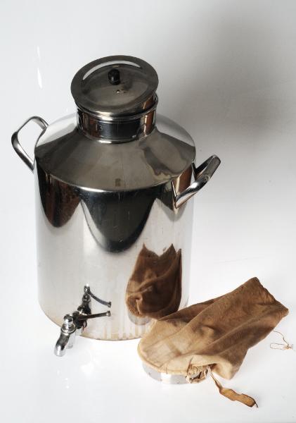 M 830. Kaffebryggare. Av rostfritt stål med tygpåse och tappningskran samt lock. H 37 cm. Diam botten 25 cm Diam hals 12,5 cm. Märkt: "13". Liten buckla finns. Använd vid bryggning av patientkaffe på avd 13 SMS. Kommer från Städcentralen SMS vid dess stängning december 1997.