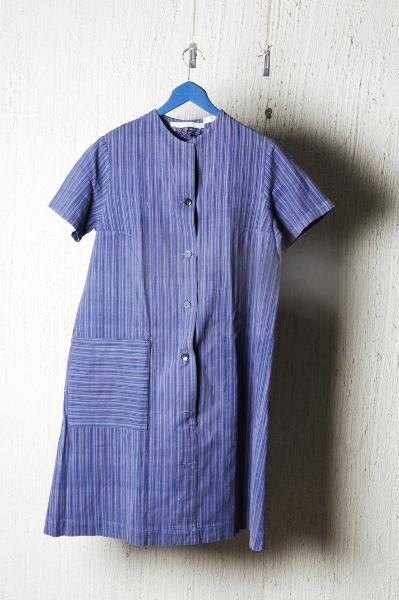 M 849. Klänning. Av bomull. Randig i lila, blå, gröna, orange smala ränder. Knäppning fram. En ficka. Märkt: "MS 4". Tyget är vävt på vävsalen SMS och den är sydd på sysalen SMS. Inlämnad av Karin Daun 12/6 - 99.
