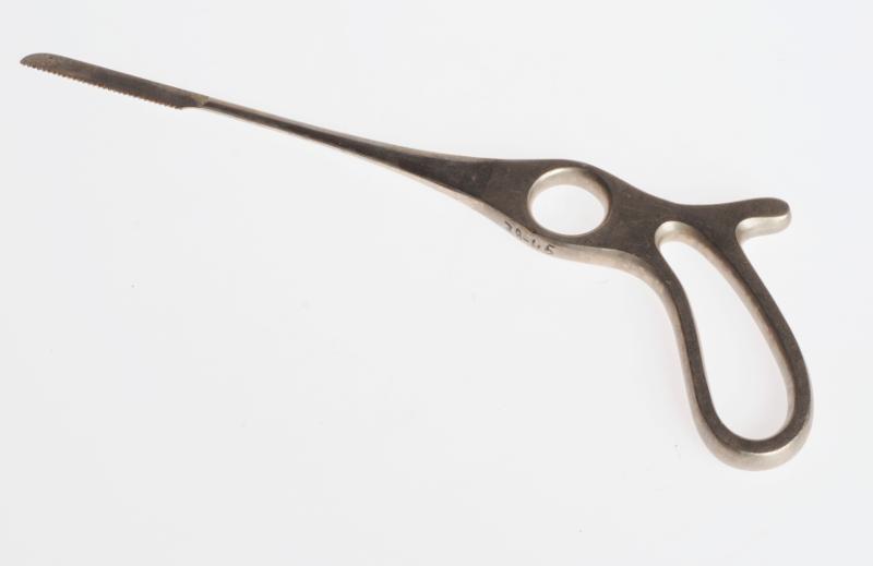 H 45. Stickbensåg. Av rostfritt stål. Öppet vinklat handtag. L 23 cm. Tillvaratagen på Ortopediska kliniken, Helsingborgs lasarett.