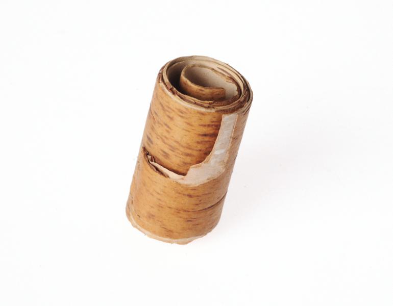 M 401.20. En rulle näver, brun. L 4,7 cm, Diam 2,6 cm.
