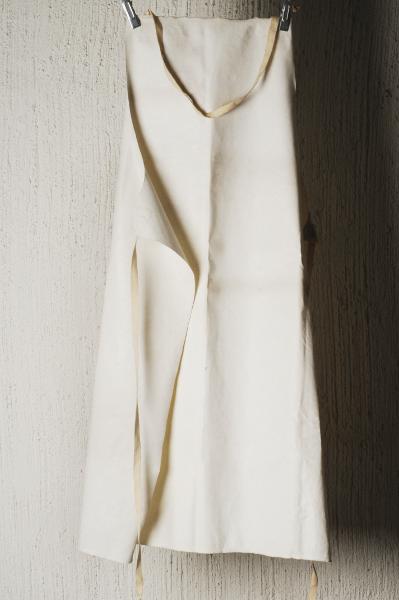 M 405. Skyddsförkläde, användes vid patientbehandling med hibernal, vit gummi med 2 st vita bomullsband att knyta med extra vit bomullstyg för att fästa bandet i fyrkant. L 97,6 cm, B 77,3 cm.