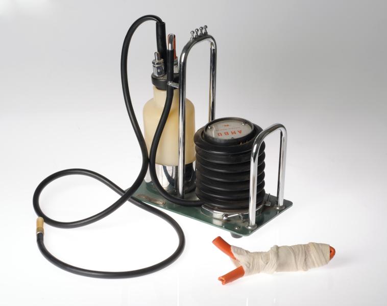 a) Grön, rekatangulär platta med svart veckad pumpanordning märkt: "AMBU Patents Pending", ansluten med svart slang till vit flaska i metallbehållare. Ytterligare en svart slang utgår från flaskan. På plattan finns även 2 st metallbågar.