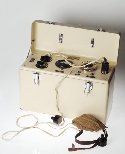 Vit apparat med lock. Locket har handtag och knäpplås. Under locket finns svarta reglage för spänning, tid m.m. Tiduret liknar en gammaldags nummerskiva till telefon. Skylt med text: "Elema Järnh Stockholm". Elektroder anslutna till apparaten via vit sladd med svart kontakt. Brunt huvudband med brun hätta att fästa elektroderna med. På locket en tejpbit med text "I B II". Apparaten har ett grönt skyddshölje med fickor på kortsidorna och hål för handtaget.