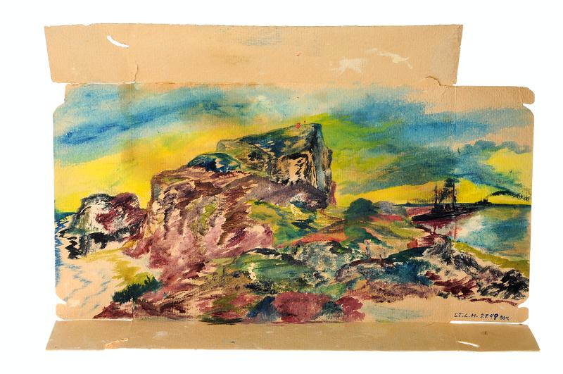 Sidan 1: Målning på utsidan av pappkartong. Motiv: "Fartyg utanför klippig kust".