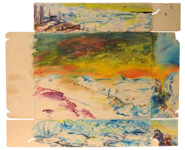 Sid 2: Målning på insidan av pappkartong. Motiv centralt: "Sanddyner", motiv överst: "Brygga" och motiv nederst: "Segelfartyg vid inlandsisens kant".