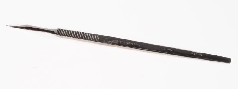 H 290. Skalpell. Enligt Jecker. För hörselgångsfurunkel. Märkt: "JECKER". L 14 cm Br 0,4 cm.