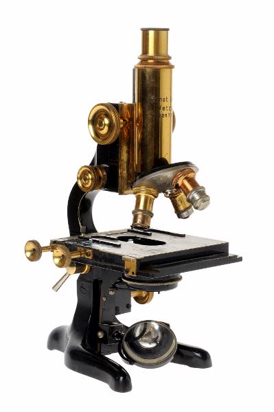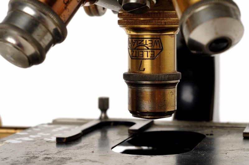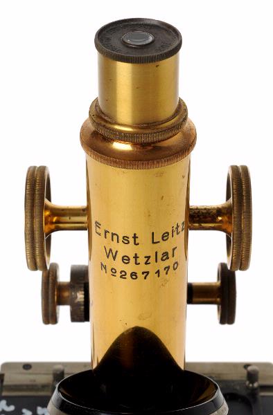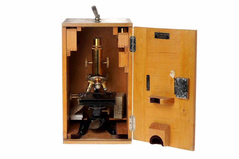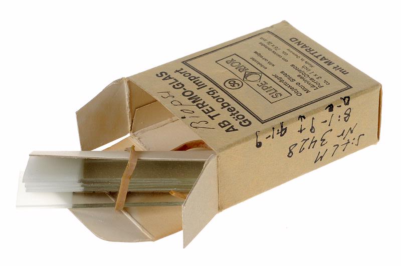 STLM 3428. Mikroskop. 1 mikroskop med 7 tillbehör. Överlämnat till muséet av "Flackarpshemmet" (tidigare TBC-avd 16 A). 1. Bärbart skåp för mikroskop. Skåpet försett med bärhandtag och har låsbar dörr samt skjutbara fack för optik, filter och preparat. Gjort av trä. Storlek: 22 x 24 x 39 cm. Märke: Axel Lundqvist A.B. Ddrottninggatan 2 Stockholm. 2. Mikroskop av märket ERNST LEITZ WETZLAR. I revolverfattning sitter 3 utbytbara objektiv. Storlek: 39 x 15 x 17 cm. Material: metall + optik. Förvaras + olika tillbehör i skåpet ovan. 3. Två stycken förvaringsdosor i mässing för objektiv. Diam 2,5 cm. Höjd: 5 cm. Sitter tillsammans med andra sådana i en skjutbar slip av trä. 4. Utbytbart objektiv av märket ERNST LEITZ WETZLAR. 6 gångers förstoring, 6x. Förvaras i samma slip som förvaringsdosorna. 5. Objektglas för utstrykning av preparat. Storlek: 7,5 x 2,5 cm. Material: glas. Förvaras i skåpet. 6. Objektglas för flytande preparat. Storlek: 7,5 x 2,5 x 2 cm. Material: glas. Förvaras i skåpet. 7. Vit ask i papp för förvaring av objektglas. Storlek: 8,3 x 4 x 0,5 cm.