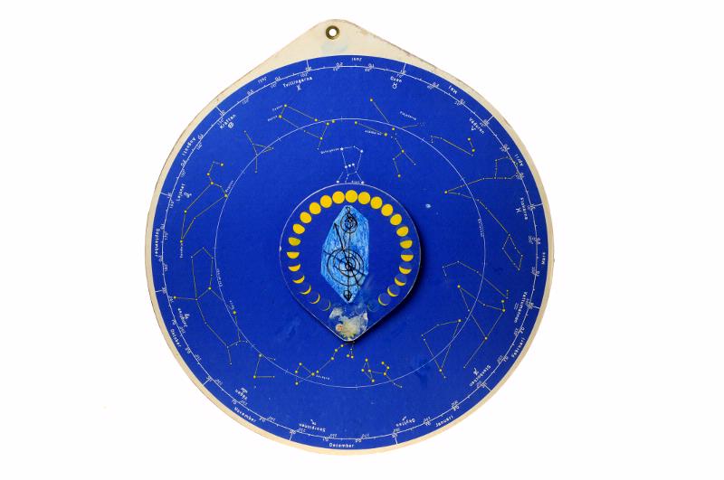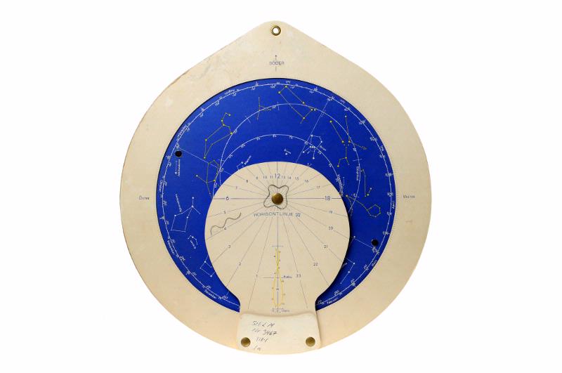 STLM 3467. Stjärnkarta. Stjärnkarta av flera lager kartong, mörkblå eller vit, som kunde snurras i förhållande till varandra. På ena sidan visas hur olika stjärnbilder står i förhållande till horisonten under årets månader. Med en knapp på ena kanten kunder stjärnkartan ställas in. På andra sidan skildras zodiaken månad efter månad. Mitt på baksidan finns en vridbar "visare", 12 cm lång och 14 cm bred, som visar månens olika faser. Ovantill finns en snibb att hålla i eller att hänga upp i eftersom här också finns ett litet metallskott hål.