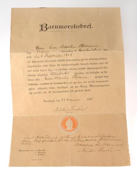 - Vitt kuvert med texten: "Barnmorske-bref för Ellen Albertina Pettersson Stockholm". Innehåller barnmorskebrev för Ellen Albertina Pettersson från Viken, med vitsordet: utmärkt. Daterat 22 december 1905, undertecknat av professor Mårten Sondén, Stockholm.
