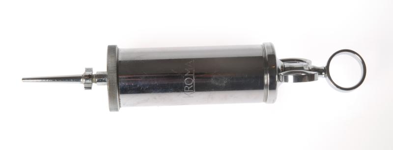 H 398. a) Sårspruta. Av metall. Märkt: "KROMA". L 24,5 cm Br 4,5 cm b) Ansats till sårspruta L 6,5 cm Br 2,2 cm. Förvärvade från Dr Gunnar Rudmark, Helsingborg. a) utgår 2013-07-19.