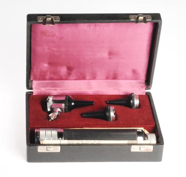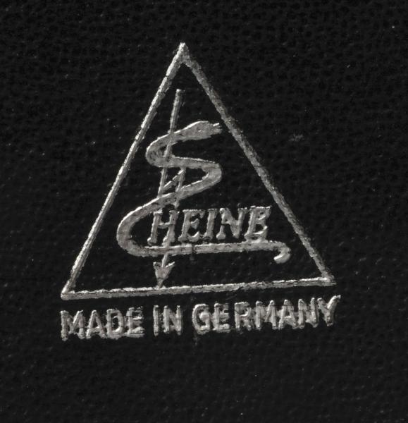 a.Etui av svart läder med lås av vitmetall. Locket med texten: Heine Made in Germany. Inuti klätt med röd sammet och siden.