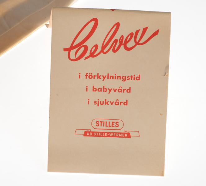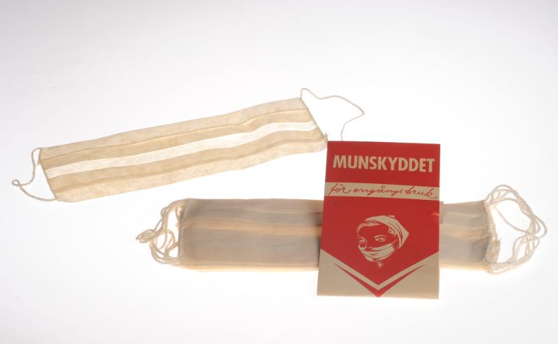 a. Munskydd i cellofanförpackning. Textskiva av papp, röd/ och vit. Stilles. L 27 cm, B 9 cm.